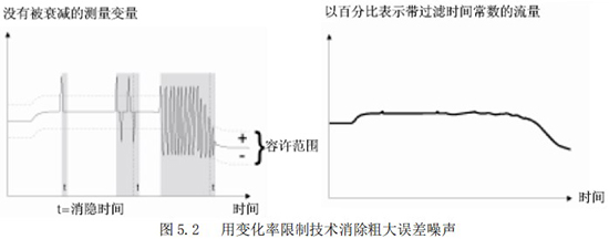 “變化率限制值”與“不敏感時間值”是用來消除某些增加阻尼不能除去的噪聲。它能夠從真實的流量信號中判別出階躍信號引起的噪聲和漿液尖狀噪聲。這種判別是以變化率的限制和持續(xù)時間為依據(jù)的。圖 5.2 所示為使用變化率限制技術去除粗大誤差的原理說明。該功能為在前面采樣中獲得的流量數(shù)據(jù)經(jīng)一階濾波后的,設定某一上限和下限(變化率)。如果當前采樣的流量數(shù)據(jù)超過或低于這個*限值,而且在超過或低于這個*限值的變化時間之內(nèi),則認為這種變化是由于噪聲所引起的,CPU 予以切除;而當超過或低于這個*限值的變化在設置的不敏感時間以外,則認為這種變化是由于真正的流量變化所引起,CPU 就認可是測量流量的變化。