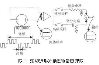 雙頻矩形波勵磁測量原理如圖1所示,一個由高低頻分量迭加而成的電磁場通過勵磁線圈被施加到被測液體中,勵磁波形是在一個低頻矩形波上迭加一個高于市電頻率的矩形波而得到的波形。在產(chǎn)生的電動勢中,低頻分量通過一個大時(shí)間常數(shù)的積分電路獲得一個零點(diǎn)穩(wěn)定性好的平穩(wěn)流量信號。而由漿液或低電導(dǎo)率流體產(chǎn)生的低頻噪聲可被不受噪聲影響的高頻采樣電路所抑制,有著同樣時(shí)間常數(shù)的流量信號經(jīng)過一個差分電路以確定流速信號的變化,把這兩種不同頻率采樣所得的信號結(jié)合起來可獲得一個穩(wěn)定流速信號,該信號不受噪聲干擾,且有較高的零點(diǎn)穩(wěn)定性。
