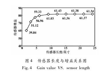 采用一臺日徑為6英寸、標準線圈的傳感器,改變傳感器長度,依次進行試驗室標定試驗。傳感器長度與增益的關(guān)系圖如圖4所示。當傳感器長度為9. 1英寸時,其增益為61. 03;但當其長度繼續(xù)增加時,增益變化較小;當其長度6. 1英寸減小到0時,增益從59. 33開始下降。也就是說,當傳感器長度為6. 1-9. 1英寸時,既有效利用了線圈產(chǎn)生的磁場,又可使傳感器長度較短。