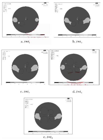 筆者探討在一體式電磁流量計(jì)徑向截面位置開(kāi)始出現(xiàn)油氣泡時(shí)一體式電磁流量計(jì)感應(yīng)信號(hào)的響應(yīng)情況。在仿真模型中,設(shè)定這樣一個(gè)過(guò)程,在連續(xù)時(shí)刻 t 1 、t 2 、t 3 、t 4 ,流量計(jì)電*位置的徑向截面上分別開(kāi)始出現(xiàn)一個(gè)油氣泡(非導(dǎo)電物質(zhì)),在 t 5 時(shí)刻出現(xiàn)的4 個(gè)油氣泡的半徑變大。在這一過(guò)程中,研究非導(dǎo)電物質(zhì)(油氣泡)的增加與變化對(duì)流量計(jì)輸出信號(hào)的影響情況;這一過(guò)程中,流體中的含水率也在變化,同時(shí)研究含水率對(duì)流量計(jì)的影響情況。圖 1 所示為流量計(jì)截面中油氣泡(非導(dǎo)電物質(zhì))增加與變化時(shí)的 Ansys 仿真圖,圖 1a ~ e 中分別顯示的是 t 1 ~ t 5 時(shí)刻虛電流 x 方向分量的 An-sys 圖。