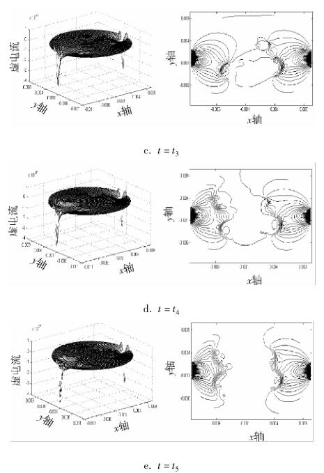 對(duì) Ansys 仿真實(shí)驗(yàn)數(shù)據(jù)通過(guò) Matlab 進(jìn)行結(jié)果分析。圖 2a ~ e 分別為 t 1 ~ t 5 時(shí)刻流體中存在油氣泡流量計(jì)測(cè)量區(qū)域虛電流在 x 方向上的分布圖及其等勢(shì)圖。從圖中可以看出:當(dāng)流體中油氣泡增加時(shí),流量計(jì)測(cè)量區(qū)域的敏感場(chǎng)發(fā)生變化,且流體中油氣泡越多,對(duì)流量計(jì)測(cè)量區(qū)域敏感場(chǎng)影響越大。為了更客觀地反應(yīng)這種現(xiàn)象,下面運(yùn)用敏感場(chǎng)靈敏度 c 進(jìn)一步進(jìn)行研究。