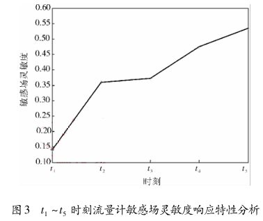 為了清晰地獲得以上 5 種情況下油氣泡對(duì)流量計(jì)虛電流分布的影響,運(yùn)用敏感場(chǎng)靈敏度來(lái)刻畫(huà)非導(dǎo)電物質(zhì)在不同情況下對(duì)流量計(jì)敏感場(chǎng)靈敏度的響應(yīng)特性。圖 3 所示為以上 5 種多個(gè)非導(dǎo)電物質(zhì)存在情況對(duì)流量計(jì)敏感場(chǎng)靈敏度響應(yīng)特性分析。從圖3中可以看出,隨著非導(dǎo)電物質(zhì)的個(gè)數(shù)在流體中的增加,流量計(jì)敏感場(chǎng)靈敏度也不斷增加,說(shuō)明對(duì)一體式電磁流量計(jì)的輸出信號(hào)的影響也越大。圖 3 中 t 3 時(shí)刻敏感場(chǎng)靈敏度 c 較 t 2時(shí)刻增加較小,這是 t 3 時(shí)刻增加的油氣泡較小,而在 t 1 ~ t 5時(shí)刻增加的油氣泡較大時(shí),流量計(jì)敏感場(chǎng)靈敏度 c變化較大,說(shuō)明流體中出現(xiàn)較大的油氣泡對(duì)流量計(jì)測(cè)量影響較大。