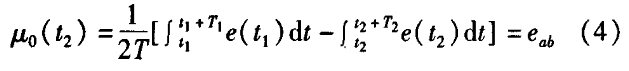 分體型電磁流量計(jì)一般都采用工頻交流電源供電,其電源電壓的幅值和頻率的變化都會(huì)給分體型電磁流量計(jì)帶來電源性干擾噪聲。對(duì)電源電壓的幅值變化,因采用多級(jí)集成穩(wěn)壓,一般而言電源電壓的幅值變化對(duì)電磁流量的測(cè)量精度影響不大。當(dāng)電源電壓的頻率波動(dòng)時(shí),雖然其波動(dòng)范圍有限,但對(duì)分體型電磁流量計(jì)測(cè)量精度影響較大。為了解決工頻干擾問題,實(shí)現(xiàn)對(duì)流體流速感應(yīng)電勢(shì)e柚信號(hào)的準(zhǔn)確測(cè)量,需利用以下基本關(guān)系:①勵(lì)磁周期為工頻周期的整數(shù)倍,即勵(lì)磁頻率為50/nHz(n為偶數(shù));②正負(fù)勵(lì)磁下的同相位采樣。圖2是對(duì)應(yīng)低頻矩形波勵(lì)磁形式下的典型電勢(shì)信號(hào)形式,按上述關(guān)系在一個(gè)勵(lì)磁周期下,若假設(shè)t。和t:點(diǎn)為工頻干擾的等效干擾點(diǎn),且采樣寬度T=T1=T2,則e –ab的基本算式為:,