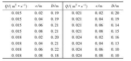 表3中,當(dāng)來流流量較小時(Q=0.015m3/s),回流區(qū)的長度D隨著浮體結(jié)構(gòu)位置的增大逐漸增大;當(dāng)來流流量較大時(Q=0.024m3/s),回流區(qū)的長度卻隨著浮體結(jié)構(gòu)位置的增大呈現(xiàn)減小的趨勢。試驗(yàn)過程中,當(dāng)浮體結(jié)構(gòu)位置較高且來流較小時,浮體結(jié)構(gòu)上下部區(qū)域的主流流速較小,回流區(qū)范圍較大;浮體結(jié)構(gòu)位置不變時,來流流量增大,回流區(qū)長度減小。來流增加,下泄水流流速較大,并迅速將回流區(qū)內(nèi)的水流帶入下游區(qū)域,因此回流區(qū)長度反而呈現(xiàn)減小趨勢。