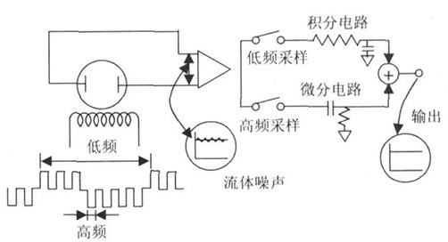 一個由高低頻分量迭加而成的電磁場通過勵磁線圈被施加到被測液體中, 勵磁波形是在一個低頻矩形波上迭加一個高于市電頻率的矩形波而得到的波形。在產(chǎn)生的電動勢中, 低頻分量通過一個大時間常數(shù)的積分電路獲得一個零點(diǎn)穩(wěn)定性好的平穩(wěn)流量信號。而由漿液或低電導(dǎo)率流體產(chǎn)生的低頻噪聲可被不受噪聲影響的高頻采樣電路所抑制, 有著同樣時間常數(shù)的流量信號經(jīng)過一個差分電路以確定流速信號的變化, 把這兩種不同頻率采樣所得的信號結(jié)合起來可獲得一個穩(wěn)定流速信號, 該信號不受噪聲干擾, 且有較高的零點(diǎn)穩(wěn)定性。