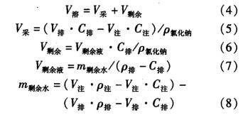 式中:V,為日溶鹽體積,m3; VA為日采鹽體積,m3 ;場余為腔體擴大后未排出液體的溶鹽體積,m3 ; Vip1*a為腔體擴大后未排出液體體積,m3m剩赫為腔體擴大后未排出的液體中等效淡水溶劑質(zhì)量,kg;V排-為日排出液體體積,m3m瑰為日注人液體體積,m3; C排為日排出液體氯化鈉質(zhì)量體積濃度,歲1; C排-為日注人液體氯化鈉質(zhì)量體積濃度,g/l;C注為日排出液體密度,kg/m3 ; p注為日注人液體密度,kg/m3,P氯化鈉為氯化鈉密度,kg/m3 ; p水為水的密度,kg/m3 ; V8為階段溶鹽體積,m3 ; C聲為聲吶測量時腔體內(nèi)氯化鈉質(zhì)量體積濃度,g/1; P聲為聲吶測量時腔體內(nèi)液體密度,kg/m3kg/M。
