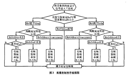 實際生產(chǎn)中流量一直在某個區(qū)域內(nèi)波動,且其動態(tài)特性不易掌握。從上面的理論中我們能夠讓誤差△£盡可能的小,這樣距我們所需要的理論值%就越接近。而減小誤差需要我們把n取的盡可能大,也就是在生產(chǎn)時間內(nèi)劃分更多的周期去調(diào)節(jié)流量。當工控機根據(jù)雙氧水計量表傳送回來的信號發(fā)出調(diào)節(jié)變頻器工作頻率的指令后,電機調(diào)整功率到雙氧水計量表的實際測量為一個工作周期,我們知道從指令發(fā)送到實際測量值返回有一個較大的滯后,如果調(diào)節(jié)的周期時間小于流量計本身的一個工作周期,那么顯然不可能達到減小誤差的目的。利用模糊控制思想H。,在控制程序中我們把流量的波動區(qū)域劃分為±缸×Yo,Yo-t-O.3,Yo±0.5四個區(qū)域,其中缸為可調(diào)節(jié)的誤差范圍,生產(chǎn)中我們?nèi)?.015,流量區(qū)域劃分的單位均為t/h。針對不同的區(qū)域采取不同的調(diào)整方案。具體流程如圖3所示。圖中變量Rel表示實際測量的流量,變量Idea表示理論流量。