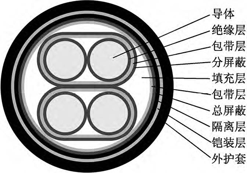 該新型電纜的結(jié)構(gòu)如圖1所示。導(dǎo)體為單股退火鍍錫軟銅線,以提高導(dǎo)體的導(dǎo)電性和防腐蝕性。在導(dǎo)體外繞包一層薄F4(聚四氟乙烯)半導(dǎo)電帶,有利于降低導(dǎo)體和絕緣之間的摩擦起電噪音。絕緣采用材料較為純凈、介電常數(shù)較小、具有一定彈性的聚丙烯絕緣級材料,并采用擠壓式擠出,減小絕緣層與導(dǎo)體的間隙。采用對絞組作為信號傳輸線,由于在兩根傳輸線上感應(yīng)的電壓接近相等,減小了電壓差值,提高了信號傳輸穩(wěn)定性;對絞組由兩種不同顏色絕緣線芯組成,相鄰線對對絞節(jié)距應(yīng)不大于100mm。對絞分屏蔽組(即對對絞組進(jìn)行分屏蔽,每對對絞組外繞包兩層聚酯帶和一層厚0.04mm鋁塑復(fù)合帶繞包,內(nèi)置一根7×0.26mm鍍錫銅絞線作引流線)有利于對不同對絞組之間信號串音的抑制和隔離。對絞分屏蔽組同心式絞合成纜,在對絞分屏蔽組間填充非吸濕性材料,以保證纜芯圓整。在成纜纜芯外繞包兩層聚酯帶,再采用鋁塑復(fù)合帶繞包,內(nèi)置鍍錫銅線作引流線,以提高電纜電磁屏蔽能力。總屏蔽層外擠包隔離層(隔離護(hù)套),隔離層采用絕緣級低密度聚乙烯材料。隔離層外采用鎧裝層,鎧裝材料為高導(dǎo)磁合金鋼帶,其為強(qiáng)磁材料,可將外來的磁通大部分限制在鎧裝層的外表面上(僅有少部分能進(jìn)入被屏蔽的空間);鎧裝時對高導(dǎo)磁合金鋼帶采用縱包焊接,確保其形成一連續(xù)圓柱管;鎧裝層可提高電纜抗電磁干擾水平以及對電纜進(jìn)行加強(qiáng),減少電纜振動引起的電動勢。外護(hù)套采用藍(lán)色軟PVC(聚氯乙烯)護(hù)層級電纜材料擠包,實(shí)現(xiàn)電纜防護(hù)。
