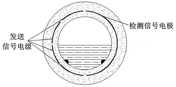 ③利用阻抗或信號衰減研制的非滿管氯化鐵流量計。這種結(jié)構(gòu)的非滿管氯化鐵流量計是當前國內(nèi)研究的方向之一。其結(jié)構(gòu)是流量管底部貼一對信號發(fā)射電*,在流量管中間貼信號接收電*。由于信號在流體中傳播會產(chǎn)生衰減,且傳播時間越長,衰減越多,因此通過信號接收電*接收到的信號衰減量即可得知液面高度;同時該電*還能測量流體切割磁感線產(chǎn)生的電動勢,以此達到測量非滿管流量的目的。阻抗式或信號衰減非滿管氯化鐵流量計結(jié)構(gòu)簡圖如圖5所示。