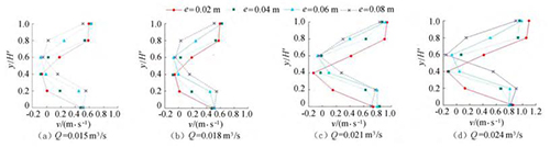 由圖5可知,當e相同時,斷面*小流速發(fā)生的位置相同,發(fā)生在浮體結(jié)構(gòu)下游回流區(qū)位置。隨著來流流量的增大,流經(jīng)浮體結(jié)構(gòu)下泄的水流流速在上層和下層水體中呈現(xiàn)增大的趨勢。浮體結(jié)構(gòu)位置不變,由于受到浮體結(jié)構(gòu)的擠壓,上游來流分別經(jīng)過浮體結(jié)構(gòu)上部、下部進行泄流,因此在下游區(qū)域的上層、下層水體中,流速較大;受浮體結(jié)構(gòu)的阻擋,浮體結(jié)構(gòu)下游區(qū)域形成回流區(qū),流速較小。試驗過程中,由于控制浮體結(jié)構(gòu)所在水域的上游、下游水位不發(fā)生變化,因此隨著來流流量的增大,流速呈現(xiàn)增大的趨勢。