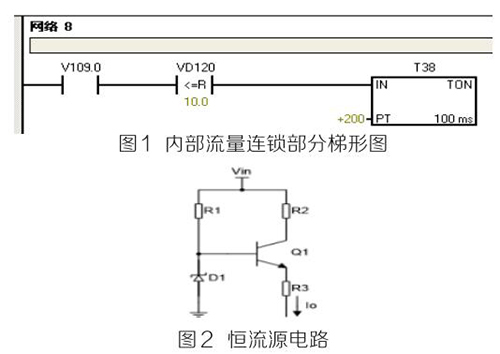 (2)PLC及模塊。PLC及模塊是自動(dòng)化控制系統(tǒng)主要設(shè)備,且PLC及模塊屬于高集成高精密電子設(shè)備,保持室內(nèi)整潔舒適,可以提高自動(dòng)化系統(tǒng)運(yùn)行穩(wěn)定性。PLC及模塊硬件運(yùn)行可靠,內(nèi)部控制程序是其控制核心軟件,如PLC硬件出現(xiàn)故障或損壞一般直接更換,但原內(nèi)部控制軟件無(wú)法上傳,整個(gè)控制系統(tǒng)成失控狀態(tài)。所以其內(nèi)部控制程序在調(diào)試驗(yàn)收合格后應(yīng)及時(shí)備份并做好標(biāo)記,為以后修復(fù)PLC故障提供保障。PLC系統(tǒng)的維護(hù)技術(shù)人員需掌握一定基礎(chǔ)PLC控制邏輯原理,對(duì)準(zhǔn)確判斷PLC故障點(diǎn)有很大的幫助。例如選礦廠水泵房S7-200系列PLC自動(dòng)抽水系統(tǒng)出現(xiàn)如下故障 :觸摸屏能控制變頻器啟動(dòng)水泵抽水,但在短時(shí)間內(nèi)會(huì)自動(dòng)停泵,導(dǎo)致無(wú)法正常抽水。通過(guò)故障現(xiàn)象可初步判斷PLC及模塊硬件設(shè)備正常,主要由于某個(gè)變量有問(wèn)題導(dǎo)致連鎖停機(jī)。打開(kāi)備份PLC控制梯形圖程序進(jìn)行相關(guān)分析,原來(lái)是排污流量計(jì)瞬時(shí)流量數(shù)值做了連鎖,其在一定時(shí)間內(nèi)瞬時(shí)流量不大于10m 3 /h時(shí),自動(dòng)停泵,電磁流量模擬量輸出電流值僅為4ma且無(wú)變化,確定排污流量計(jì)有故障。可臨時(shí)應(yīng)急維修,模擬量模塊輸入模擬電流值10ma~20ma之間一固定數(shù)值即可恢復(fù)正常運(yùn)行。制作簡(jiǎn)單恒流源電路代替排污流量計(jì)輸出的模擬電流量,實(shí)現(xiàn)解決水泵無(wú)法正常運(yùn)行的故障。