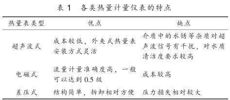 目前供熱行業(yè)內(nèi)使用的熱量計(jì)量儀表按工作原理主要分為超聲波式、 電磁式、 差壓式, 其特點(diǎn)見表 1 。 熱量計(jì)量儀表按結(jié)構(gòu)可分為一體式和分體式, 一體式熱量表將一支入口或出口溫度傳感器嵌入到流量傳感器管道中, 并配有專門的計(jì)算器進(jìn)行熱量計(jì)算; 分體式熱量表采用單獨(dú)的流量傳感器, 包括超聲波流量計(jì)、 電磁流量計(jì)、 差壓流量計(jì)、出水口流量計(jì)等, 溫度測量采用單獨(dú)的鉑電阻溫度計(jì)或溫度變送器測量供回水管道溫度, 再配備熱量積算儀進(jìn)行溫度和流量信號(hào)采集得到熱量值。