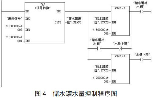 (2)程序設計。儲水罐水量控制的工作過程為:當壓力變送器檢測到儲水罐的水量低于 450kg 時,補水閥 3 開啟為儲水罐補水;當水量達到 490kg 時,補水閥 3 關閉;生產(chǎn)配制過程中,循環(huán)以上控制過程。儲水罐水量控制的程序如圖 4 所示。
