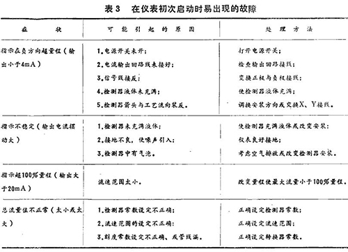 在儀表指示不正常時,可根據(jù)下面介紹的一些典型故障和處理方法進(jìn)行必要的處理。這些故障可分為啟動時易產(chǎn)生的故障,正常運(yùn)行時出現(xiàn)的故障和接地不良引起的故障(見表3、表4)。