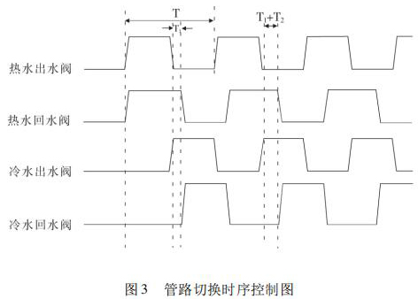 開始試驗(yàn),冷熱水箱預(yù)先達(dá)到試驗(yàn)要求溫度,水泵運(yùn)轉(zhuǎn)調(diào)節(jié)管路流量至設(shè)定值。系統(tǒng)給定信號控制四個(gè)開關(guān)閥(熱水出水閥、熱水回水閥、冷水出水閥、冷水回水閥) 的打開與關(guān)閉,實(shí)現(xiàn)冷熱水的切換。熱水沖擊時(shí),熱水出水閥與熱水回水閥打開的同時(shí),冷水出水閥與冷水回水閥關(guān)閉,確保試驗(yàn)管路熱水沖擊;同理,冷水沖擊時(shí),冷水出水閥與冷水回水閥打開,熱水出水閥與熱水回水閥關(guān)閉,確保試驗(yàn)管路冷水沖擊。系統(tǒng)通過四個(gè)開關(guān)閥對管路進(jìn)行時(shí)序控制,達(dá)到管路切換的目的,很好地實(shí)現(xiàn)了 4000次冷熱循環(huán)沖擊試驗(yàn)。其具體的管路切換控制時(shí)序圖如圖 3 所示。