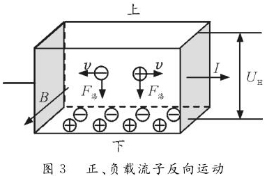 反之,如圖2所示,若載流子帶負(fù)電荷,則載流子在洛倫茲力作用下會(huì)向下偏轉(zhuǎn),導(dǎo)體下表面積累負(fù)電荷。同時(shí),上表面失去負(fù)電荷而帶上正電,從而使上表面電勢高于下表面。