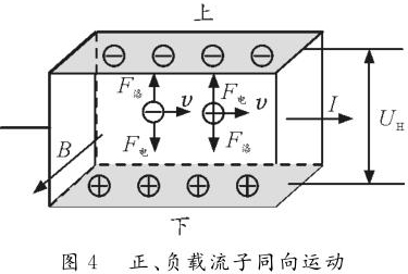 情形2:正、負(fù)載流子反向運(yùn)動(dòng)。如圖3所示,長方體玻璃水槽中盛有NaCl的水溶液,水槽左、右側(cè)壁內(nèi)側(cè)各裝一導(dǎo)體片,在溶液中通入水平向右的電流,勻強(qiáng)磁場B垂直紙面向外。NaCl溶液中既有正離子,又有負(fù)離子,根據(jù)左手定則可判斷正離子受到向下的洛倫茲力,故向下運(yùn)動(dòng)并堆積。同理,負(fù)離子也受到指向下的洛倫茲力,也向下運(yùn)動(dòng)并堆積。由于正負(fù)離子均向下側(cè)面堆積,故上下兩側(cè)面的電勢均為零,但下側(cè)面處離子濃度大于上側(cè)面離子濃度。