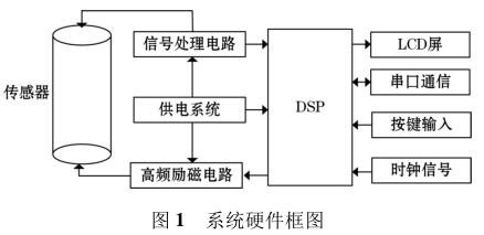 高頻勵磁電鍍廢水流量表由傳感器、高頻勵磁電路、信號處理電路等組成,其中高頻勵磁電路決定著傳感器磁場的強弱,勵磁電路的穩(wěn)定性以及精確性決定著系統(tǒng)檢測的準(zhǔn)確性以及穩(wěn)定性。DSP 系統(tǒng)控制勵磁電路激勵傳感器線圈,當(dāng)線圈中有導(dǎo)電液體流過時,其切割磁感線并在傳感器兩端的線圈上產(chǎn)生感應(yīng)電動勢,利用信號檢測電路監(jiān)測感應(yīng)電動勢的大小,*后根據(jù)相應(yīng)關(guān)系計算出液體的流量,系統(tǒng)硬件框圖如圖 1 所示。