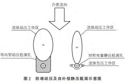 新泥漿管道流量計(jì)采用拋物面導(dǎo)向型結(jié)構(gòu)作為動(dòng)壓測(cè)點(diǎn),采用對(duì)稱自補(bǔ)償型式的靜壓測(cè)點(diǎn),可以有效地解決來(lái)流方向偏流時(shí)信號(hào)的穩(wěn)定采集,來(lái)流偏離管道軸線時(shí),可以維持輸出差壓基本不變,如圖2所示。