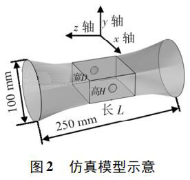 使用 Pro /E 軟件建立三維幾何模型,導(dǎo)入 COMSOL 軟件進(jìn)行有限元求解。仿真模型如圖 2 所示,電*連線為x 軸,連線中點為坐標(biāo)原點,流體運動方向為 z 軸,傳感器管道口徑為 DN100,總長250 mm。異徑管部分初始結(jié)構(gòu)尺寸 L = 80 mm,D = 80 mm,H = 40 mm,圓形電*半徑為17 mm,伸出絕緣襯里的*大距離為 1. 5 mm。