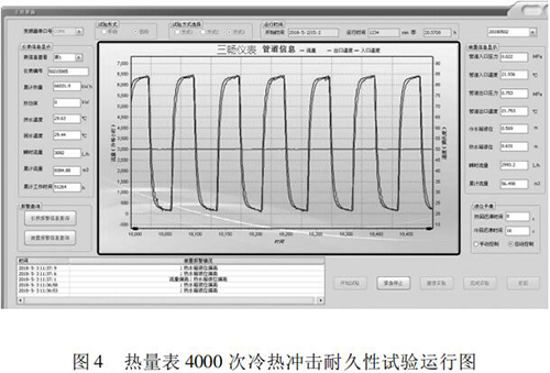本文研究的 4000 次冷熱沖擊試驗(yàn)的實(shí)現(xiàn)具有以下特點(diǎn): (1)基于“工控機(jī) +水泵 + 潛水電磁流量計(jì)”的閉環(huán)控制系統(tǒng),實(shí)現(xiàn)了流量自動(dòng)反饋調(diào)節(jié),滿足試驗(yàn)要求; (2)通過(guò)四個(gè)開(kāi)關(guān)閥的時(shí)序切換,自動(dòng)控制試驗(yàn)溫度,很好的完成了 4000 次溫度沖擊試驗(yàn); (3)通過(guò)“工控機(jī) + 數(shù)據(jù)數(shù)據(jù)采集卡”的數(shù)據(jù)采集系統(tǒng),實(shí)時(shí)監(jiān)控試驗(yàn)過(guò)程中的流量、溫度、壓力等相關(guān)參數(shù),實(shí)現(xiàn)試驗(yàn)方式的自動(dòng)控制,并能對(duì)試驗(yàn)數(shù)據(jù)進(jìn)行分析與評(píng)定。 (4)試驗(yàn)的全過(guò)程為智能自動(dòng)化,可無(wú)人員留守看護(hù)。試驗(yàn)結(jié)果可直接反映出熱量表在長(zhǎng)時(shí)間運(yùn)行后的可靠性。為我國(guó)熱量表耐久性試驗(yàn)研究提供檢測(cè)手段,為促進(jìn)產(chǎn)品質(zhì)量提升做好技術(shù)保障。