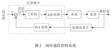 通信控制系統(tǒng)由工控機(jī)、變頻器、水泵、數(shù)據(jù)采集卡、潛水電磁流量計(jì)等組成。在整個(gè)熱量表耐久性試驗(yàn)裝置中,潛水電磁流量計(jì)與被試驗(yàn)熱量表串聯(lián)在試驗(yàn)管路中。系統(tǒng)設(shè)定流量值 qs,通過(guò)工控機(jī)發(fā)送信號(hào)給變頻器,來(lái)控制水泵運(yùn)轉(zhuǎn),系統(tǒng)通過(guò)研華數(shù)據(jù)采集卡 PCI1711 將采集到的潛水電磁流量計(jì)當(dāng)前瞬時(shí)流量值反饋給工控機(jī),工控機(jī)將返回流量值與設(shè)定流量值qs進(jìn)行比較,從而確定是否需要重新調(diào)整變頻器頻率控制水泵轉(zhuǎn)速。此過(guò)程是一個(gè)完整的閉環(huán) PID 控制過(guò)程,其閉環(huán)控制過(guò)程如圖 2 所示。 2. 2 管路切換系統(tǒng)管路切換主要由冷熱水箱、水泵、開(kāi)關(guān)閥等組成。要實(shí)現(xiàn)熱量表耐久性 4000 次冷熱沖擊試驗(yàn),需要實(shí)時(shí)控制管路中熱水與冷水的交替使用。