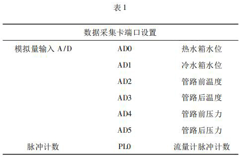 數(shù)據(jù)采集系統(tǒng)由工控機(jī)、潛水電磁流量計(jì)以及數(shù)據(jù)采集卡組成。 4000 次冷熱沖擊試驗(yàn)要求在在*大流量 qs 條件下運(yùn)行,對(duì)流量數(shù)據(jù)的采集用到潛水電磁流量計(jì)及數(shù)據(jù)采集卡。潛水電磁流量計(jì)采集管路流量,數(shù)據(jù)采集卡將潛水電磁流量計(jì)采集到的數(shù)據(jù)反饋給工控機(jī)系統(tǒng)。過(guò)程中,試驗(yàn)管路水溫以及水箱水位的采集控制也是通過(guò)數(shù)據(jù)采集卡反饋給系統(tǒng)控制。試驗(yàn)過(guò)程用到的數(shù)據(jù)采集卡采用研華生產(chǎn)的PCI - 1711。PCI - 1711 是一款多功能 PCI 總線數(shù)據(jù)采集卡,具有 16 路單端模擬量輸入功能、2 路 12位模擬量輸出功能、16 路數(shù)字輸入和 16 路數(shù)字輸出功能、計(jì)數(shù)器功能等。為保證冷熱沖擊試驗(yàn)結(jié)果的準(zhǔn)確性,嚴(yán)要求嚴(yán)格控制管路流量以及管路壓力。因此,管路設(shè)置前后管路溫度、冷熱水箱水位以及管路壓力的采集,管路流量根據(jù)潛水電磁流量計(jì)脈沖計(jì)數(shù)進(jìn)行采集,其數(shù)據(jù)采集卡端口設(shè)置如表 1 所示。