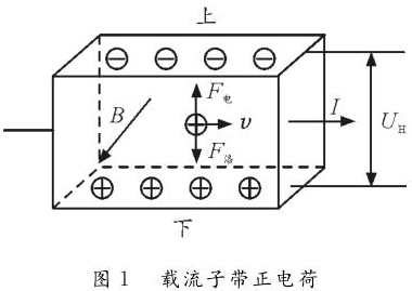 情形1:單種載流子。如圖1所示,若載流子帶正電荷,則載流子在洛倫茲力作用下會向下偏轉(zhuǎn),導(dǎo)體下表面積累正電荷。同時,上表面失去正電荷而帶上負電,從而使下表面電勢高于上表面。