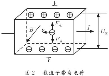 反之,如圖2所示,若載流子帶負電荷,則載流子在洛倫茲力作用下會向下偏轉(zhuǎn),導(dǎo)體下表面積累負電荷。同時,上表面失去負電荷而帶上正電,從而使上表面電勢高于下表面。