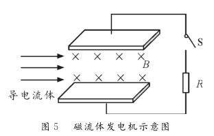 【例1】圖5為磁流體發(fā)電機示意圖。設(shè)兩金屬板間的距離為d,兩*板間勻強磁場的磁感應(yīng)強度為B。等離子體垂直進入磁場的速度為v,單個離子所帶的電荷量為q。離子通道(即兩*板內(nèi)所圍成的空間)的等效電阻為r,負載電阻為R。則下列判斷正確的是( )