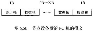 在紙漿流量計(jì)等節(jié)點(diǎn)設(shè)備和C機(jī)通信的過程中,由地址幀、命令幀、數(shù)據(jù)幀、校驗(yàn)和可組成各種功能不同的報(bào)文。由于采用主從工作方式來實(shí)現(xiàn)通信,紙漿流量計(jì)等節(jié)點(diǎn)設(shè)備僅能接收并執(zhí)行PC機(jī)發(fā)送來的控制命令,而不能發(fā)送命令給PC機(jī)。因此,由PC機(jī)發(fā)往流量計(jì)等節(jié)點(diǎn)設(shè)備的報(bào)文一般包括一個(gè)地址幀,一個(gè)命令幀,若干個(gè)數(shù)據(jù)幀和一個(gè)校驗(yàn)和,其報(bào)文格式圖.6a5所示;而由流量計(jì)等節(jié)點(diǎn)設(shè)備發(fā)往PC機(jī)的報(bào)文一般包括一個(gè)地址幀,若干個(gè)數(shù)據(jù)幀和一個(gè)校驗(yàn)和,其報(bào)文格式如圖6.5b所示。