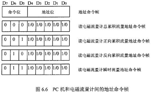 由于RS一485電氣標(biāo)準(zhǔn)規(guī)定每段只能聯(lián)結(jié)犯個(gè)節(jié)點(diǎn)設(shè)備,因此可用地址幀中五個(gè)二進(jìn)制位表示這32個(gè)地址,其余3位用來表示命令,從而構(gòu)成地址命令幀。對(duì)于控制命令需求不超過八個(gè)的通信系統(tǒng),采用地址命令幀可壓縮報(bào)文長度提高通信效率。在污水網(wǎng)絡(luò)監(jiān)控系統(tǒng)中,紙漿流量計(jì)和PC機(jī)通信的主要目的是將流量計(jì)中的有用數(shù)據(jù)讀到PC機(jī)中。這些數(shù)據(jù)包括:總累積流量、正向累積流量、反向累積流量、瞬時(shí)流量。通信時(shí),PC機(jī)只需向紙漿流量計(jì)發(fā)送讀總累積流量、讀正向累積流量、讀反向累積流量、讀瞬時(shí)流量命令即可,因此二者間通信所用的地址幀和命令幀可合二為一,用一個(gè)地址命令幀代替。PC機(jī)和紙漿流量計(jì)間的地址命令幀定義如圖.66所示。根據(jù)污水網(wǎng)絡(luò)監(jiān)控系統(tǒng)中PC機(jī)與紙漿流量計(jì)間通信的特殊性,二者通信所使用的報(bào)文可簡化為圖.67的格式。