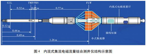 1. 2 內(nèi)流式集流智能高溫水流量計如圖 4 所示,內(nèi)流式集流電磁組合測井儀主要采用內(nèi)流式集流智能高溫水流量計,并組合了井溫壓力磁定位儀。利用電磁感應原理測量平均流速,體積流量計算公為: