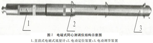 電磁式同心測調(diào)儀是同心分層注水工藝技術(shù)的關(guān)鍵儀器,其設(shè)計(jì)理念:集成流量測試與水量調(diào)節(jié)于一體,實(shí)現(xiàn)測調(diào)同 步;動(dòng)力傳遞設(shè)計(jì)為同心降速機(jī)制,機(jī)械結(jié)構(gòu)簡單,動(dòng)力傳遞效率高,測調(diào)穩(wěn)定性高。主要包括以下結(jié)構(gòu),如圖2所示。