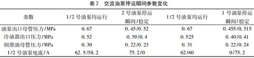 通過內(nèi)部旁通將冷油與熱油混合,經(jīng)過銅粉- 煤油 - 蠟感溫元件控制冷熱油混合比例,將油溫調(diào)節(jié)到 49 ℃。一臺氨水流量計穩(wěn)定運行,油泵出口母管壓力 0. 5 MPa,潤滑油母管壓力 0. 24 MPa,均屬于正常情況,而兩臺交流油泵并列運行時,停運其中一臺交流油泵瞬間會觸發(fā)電磁流量計出口母管壓力開關(guān)動作,說明停運瞬間油壓發(fā)生波動,且油泵出口母管油壓波動至小于 0. 45 MPa。正常運行時電磁流量計出口油溫 71.5 ℃,冷油器出口溫度45 ℃,混合后潤滑油母管溫度52.5 ℃,由能量守恒定律可知,經(jīng)過冷油器的油量/不經(jīng)冷油器的油量= ( 71.5-52.5) ÷ ( 52.5- 45) = 2. 53,說明有 70% 左右的油量經(jīng)過冷油器。當 2 臺氨水流量計運行時油量大于單泵運行,其中一臺電磁流量計瞬間停運時油量減少,尤其是經(jīng)過冷油器的油量大量減少,油量在溫控閥二次分配過程中出現(xiàn)調(diào)節(jié)異常,導致油壓過大波動。為檢驗溫控閥工作情況,保持 1 號、2 號交流油泵運行,選取機組正常帶負荷運行時油溫 52 ℃,分別停運 1、2 號交流油泵,觀察 1、2 號交流油泵停運瞬間油泵出口母管壓力波動情況,試驗各參數(shù)變化見表 2。