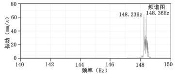 *后,通過對兩臺凝電磁流量計并列運(yùn)行工況下的出口管道振動進(jìn)行頻譜分析(見圖2)發(fā)現(xiàn),葉片通過頻率附近出現(xiàn)了兩個相距很近的頻率,分別為148.23Hz和148.36Hz。這兩個頻率的振動分屬于兩臺凝電磁流量計所引發(fā)的,即兩臺凝智能電磁流量計工作轉(zhuǎn)速有微小差別,導(dǎo)致兩個頻率分量之間也出現(xiàn)了微小差別,進(jìn)而導(dǎo)致拍振現(xiàn)象。
