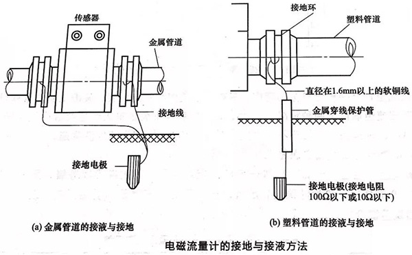 如下圖所示,電磁流量計(jì)的接地與接液方法如下: