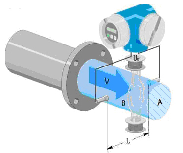據(jù)法拉*電磁感應(yīng)原理,在與測量管軸線和磁力線相垂直的管壁上安裝了一對檢測電*,當(dāng)導(dǎo)電液體沿測量管軸線運動時,導(dǎo)電液體切割磁力線產(chǎn)生感應(yīng)電勢,此感應(yīng)電勢由兩個檢測電*檢出,數(shù)值大小與流速成正比例,其值為: