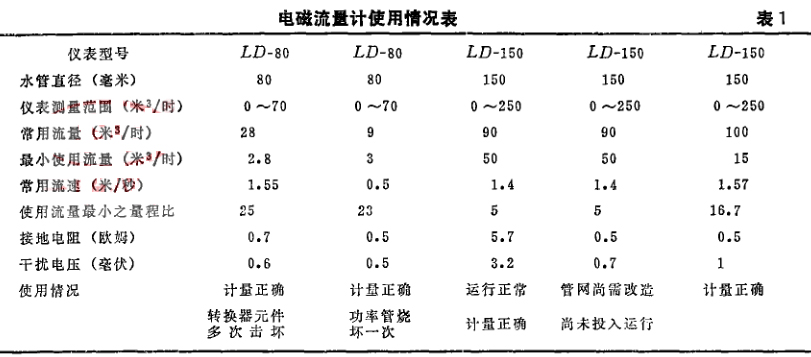 我廠自1981年3一8月,分別對四個車間的用水點安裝了五臺儀表,每臺配用一支DX S-102積算器,測定的是生產(chǎn)用水,溫度為常溫,電導率為1.2x10-3姆歐,安裝方式為水平有旁路伐(見表1)。