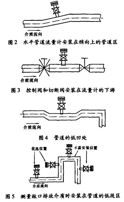 為了保障測(cè)量精度,傳感器應(yīng)避免在容易產(chǎn)生真空、氣體、渦流等地方安裝,傳感器與智能變送器之間的通訊電纜要避開(kāi)電動(dòng)機(jī)等強(qiáng)電設(shè)備。建議安裝在圖2~圖5所示位置。