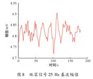 在頻域中對紙漿信號觀察時發(fā)現(xiàn),紙漿信號的漿液噪聲頻帶在零頻率點附近,距離流量信號基波頻率點較遠,對基波幅值和各奇次諧波幅值基本沒有影響,紙漿信號在頻域中的圖形如圖7所示。選擇一組采集的紙漿信號,把其等分成數(shù)段,利用MATLAB計算每段數(shù)據(jù)在基波處的幅值并提取保存在一個數(shù)組中,使用繪圖工具畫出來,如圖8所示。可見,基波幅值在4.7~4.95mV變化,波動較小。因此,提取到的與流量相關(guān)的感應電動勢信號幅值會比較穩(wěn)定。