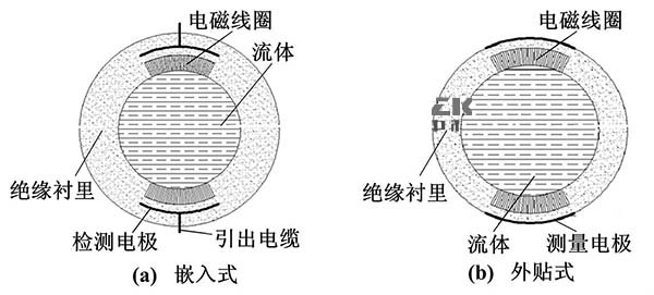 電容式水處理流量計從根本上解決了電*表面附著、腐蝕、摩擦等問題,其電*與被測流體間有絕緣襯里隔離,或者直接采用絕緣測量管。電*置于測量管外面或鑲嵌于測量管內(nèi)部。嵌人式水處理流量計和外貼式水處理流量計的結(jié)構如圖2所示。
