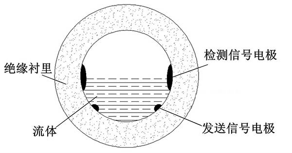 ①多電*式非滿管水處理流量計。其底部是一對信號注人電*,中間有多對測量電*,頂端有一個滿管電*。在滿管情況下,該流量計與普通的水處理流量計的功能相同,滿管情況下流體的橫截面積是固定的,此時計算流量值只需要測量流體的流速即可。當流體非滿管時,滿管電*檢測到管道非滿狀態(tài),利用算法修正測量值,此時流量計的測量方式改成測量流體流速和液面高度。信號注人電*與在不同位置的三對測量電*共同工作,用于測量液位面的高度和流體的速度。多電*式非滿管水處理流量計結(jié)構簡圖如圖3所示。