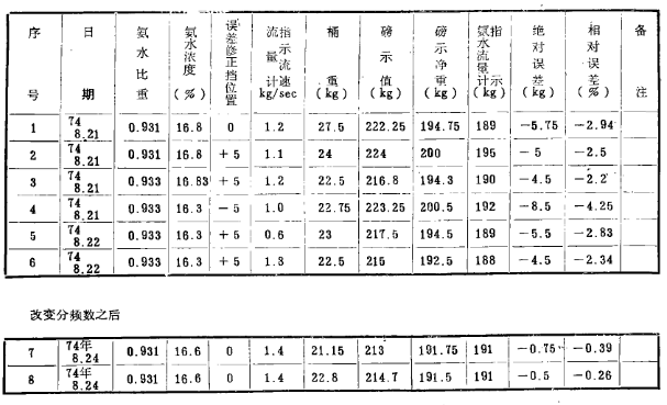 測(cè)試方法:將氨水通過流量計(jì)計(jì)量后,放入氨水桶,用磅秤稱其重量,以磅秤示數(shù)為標(biāo)準(zhǔn),求氨水流量計(jì)之誤差。現(xiàn)將幾次典型實(shí)測(cè)數(shù)據(jù)列表于后:
