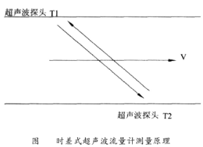 時差式超聲波流量計用于測量流體流速對雙向聲波信號的影響。它的兩個換能器探頭(T1、T2)以一定的間距安裝在管壁外側,交替發(fā)射和接收超聲波。當超聲波在靜止的流體中傳播時,從T1到T2的聲波信號傳送時間與從T2到T1的傳送時間相同;當流體流動時,上游換能器T1向下游換能器T2發(fā)射一個信號,同時下游也向上游發(fā)射信號,由于流體流速對超聲波信號的作用,加快從上游到下游方向的信號傳播速度,同時減慢從下游到上游方向的信號傳播速度,兩個信號之間產生了時間差。由此求得流體的流速,再與圓管的流通截面積相乘計算出流量。流體流速的基本計算公式: