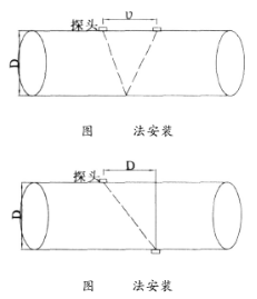 目前換能器探頭安裝方式主要有V法和Z法兩種安裝方式,如圖2、3所示。V法安裝,超聲波信號行程增加一倍,適用于小管徑,管道條件好的流量測量。Z法安裝超聲波信號衰減小,適用于大管徑。一般來說。D>300mm的管道易采用Z法安裝。