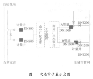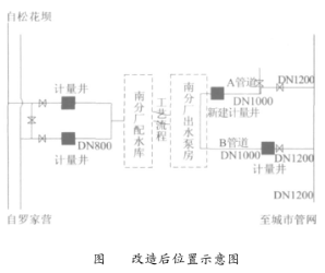 根據(jù)上述分析及現(xiàn)場勘測發(fā)現(xiàn):昆明市*五自來水廠出水A管道時差式超聲波流量計安裝位置下游長度不滿足要求,在探頭安裝位置下游附近管道管徑由1.0m變?yōu)?.2m,并且接有一根DN200的支管。因此在供水高峰期時,此段由于三通、閥門影響,水流易產生紊流、渦流從而產生氣泡,大大減小聲波信號的強度,致使時差式超聲波流量計出現(xiàn)信號中斷。通過在探頭位置靠近出水泵房一側移動7m挖計量井,其位置滿足上下游直管段長度要求,利用便攜式超聲波流量計在此位置進行水流計量檢驗,其結果信號良好。由此說明先前探頭安裝直管段長度不滿足要求造成信號中斷。時差式超聲波流量計位置見圖4。