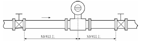 dn65一體式電磁流量計(jì)的安裝質(zhì)量對(duì)其測(cè)量結(jié)果的影響較大,因此在安裝時(shí)需要注意幾個(gè)問題。*先,dn65一體式電磁流量計(jì)直管段的選擇在配管時(shí)一定要按照要求進(jìn)行選擇,一般選擇流量計(jì)通徑與工藝管道通徑相同,即可滿足工程需要,而且安裝方便、壓力損失小,流量計(jì)直管段上游側(cè)的長度不少于5倍工藝管道直徑,下游側(cè)的長度不少于3倍工藝管道直徑(圖2)。但在流速太慢而又要求精度較高或需要變徑的應(yīng)用場(chǎng)合,可選擇通徑小于工藝管道通徑的流量計(jì),以提高測(cè)量精度,此時(shí)流量計(jì)上、下游必須加裝異徑管,且進(jìn)口異徑管上游側(cè)應(yīng)有長于10倍工藝管道直徑的直管段,下游側(cè)應(yīng)有長于5倍工藝管道直徑的直管段(圖3)。